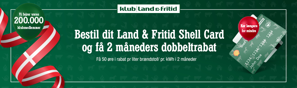 Hvis du bestiller Klub Land & Fritids Shell Card i februar, får du dobbeltrabat*, dvs. 50 øre pr. liter eller pr. kWh i rabat i 2 måneder fra den dag, du bestiller dit kort.